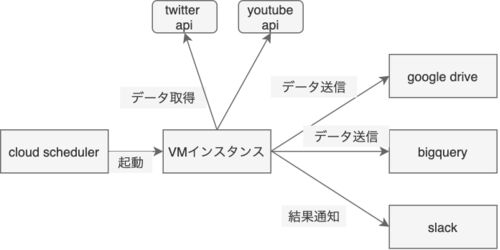 はじめに データ分析をするにはデータが必要ですが、常に欲しいデータが存在するとは限らず、 時には自分で取得・保存する必要が出てくると思います。 ここではGCPを用いてデータ収集環境を構築してみた備忘録を記述します。 実施概要 apiを使って日次でvtub…